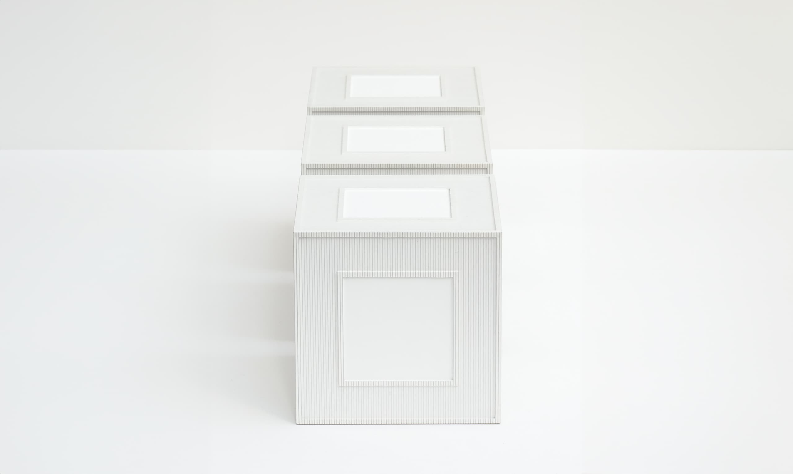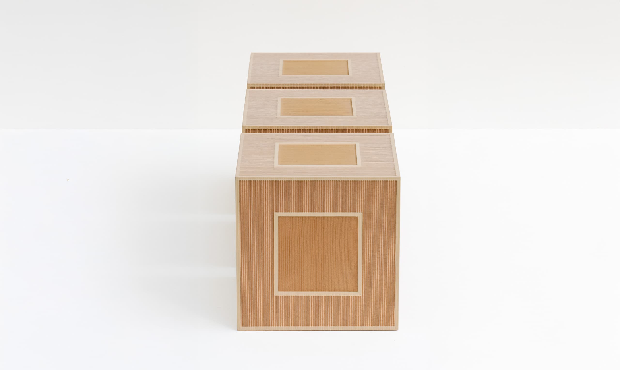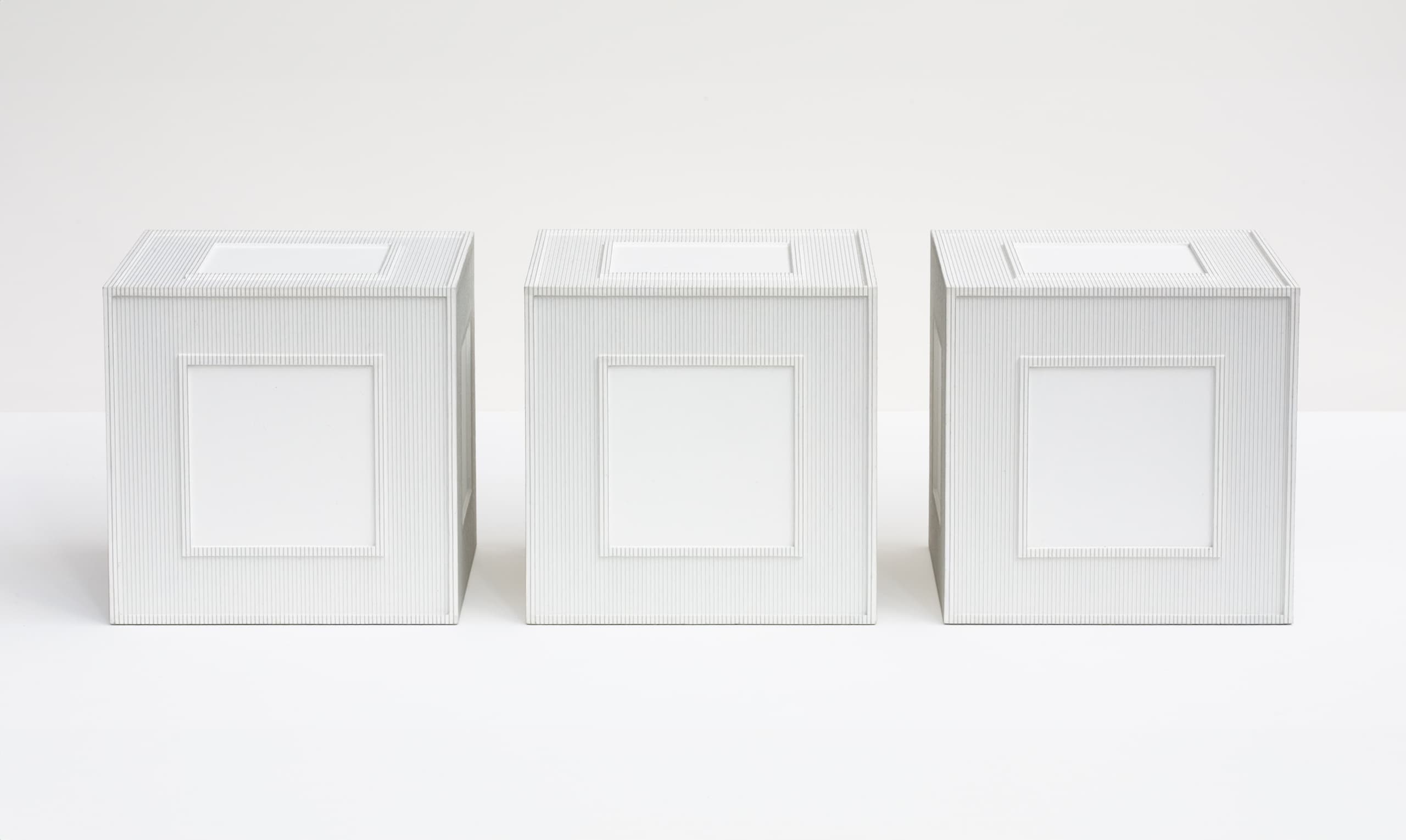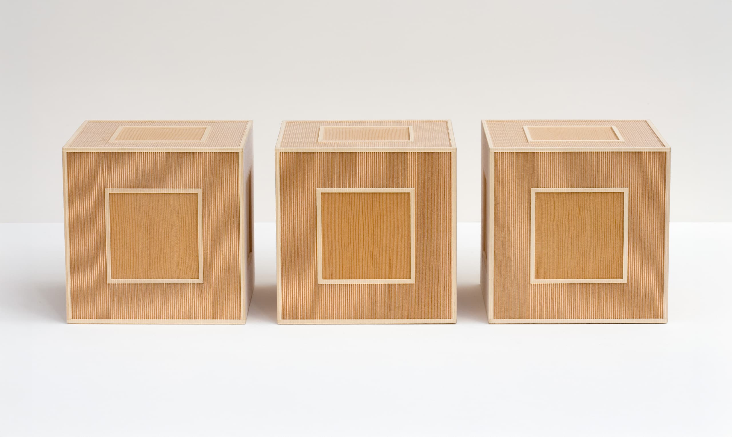 FLOOR PIECE #5 (2003) | Wood, thread, and acrylic paint, 3 x 5.25 x 5.25 x 5.25 in (7.6 x 13.3 x 13.3 x 13.3 cm) each cube