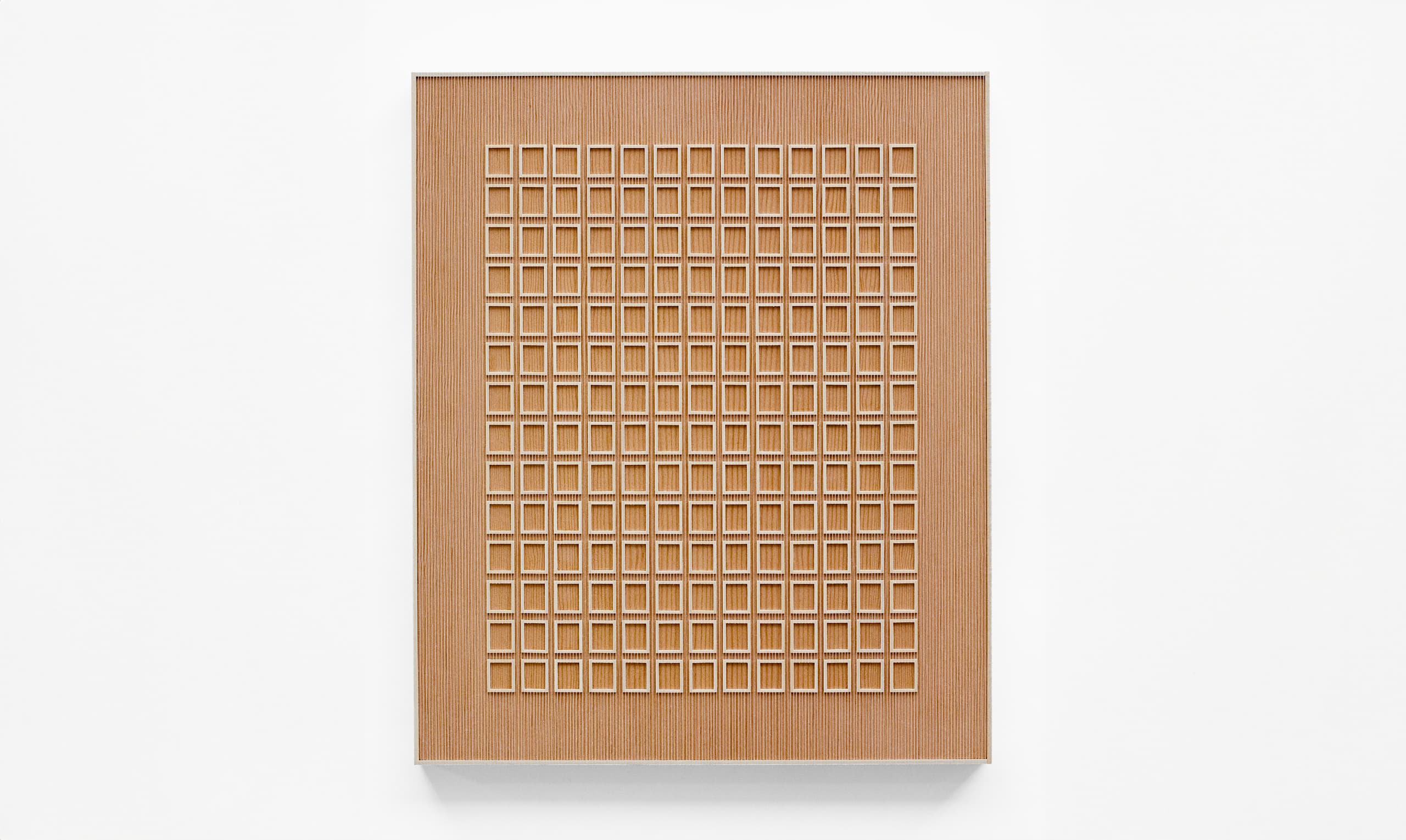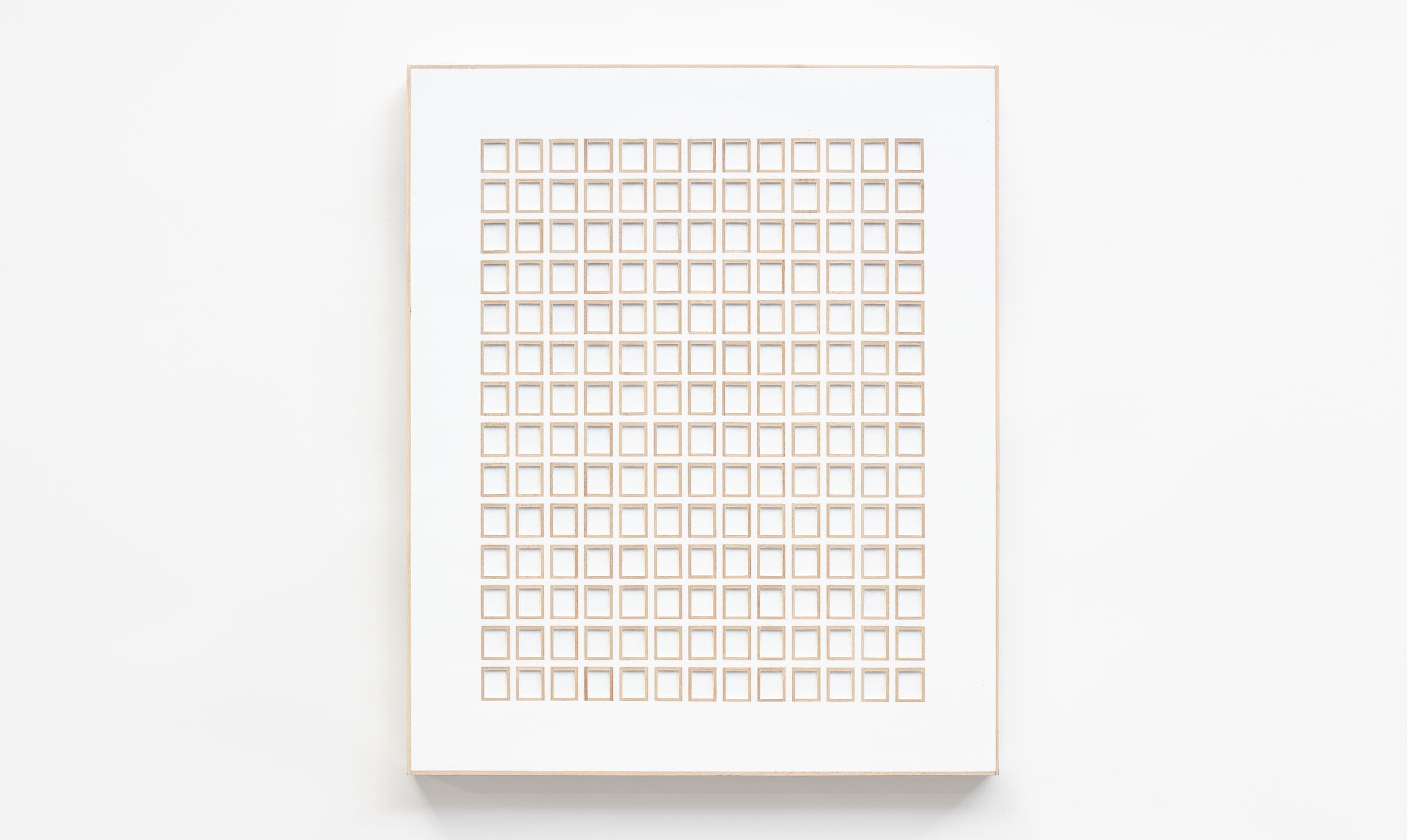 GROUT PIECE #10 (2003) | Wood, thread, and acrylic paint, 14.25 x 11.75 x 1 in (36.2 x 29.8 x 2.5 cm)